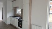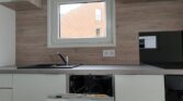 1 cuisine ouverte avec cuisinière à gaz, réfrigérateur-congélateur et lave-vaisselle